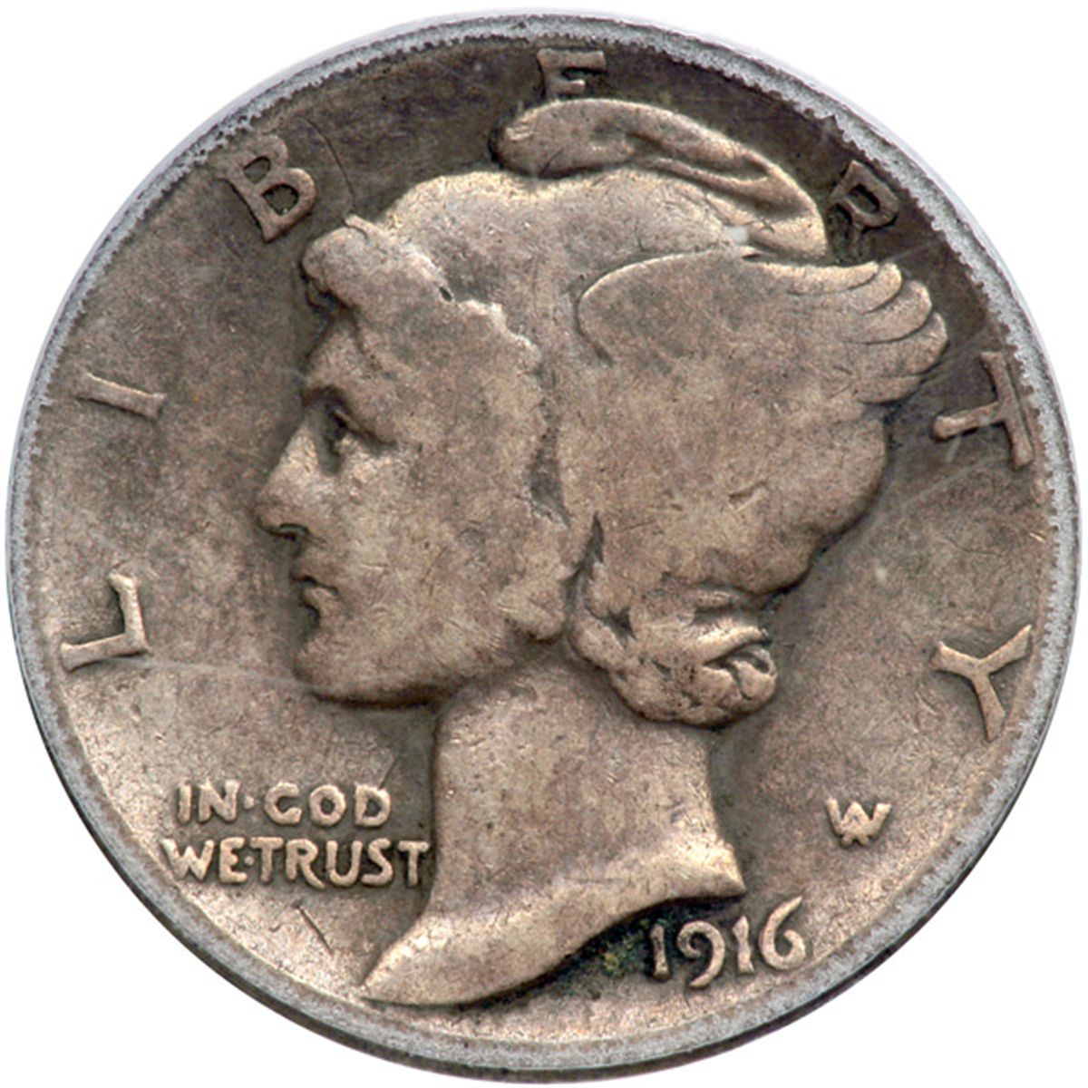 1916-D Mercury Dime. PCGS graded Good-4. Even wear with a strong date and mint mark. The is the most sought-after date in the series, one of only 264,000 minted, most saw heavy circulation before being withdrawn and melted once they were too badly worn (PCGS # 4906) .