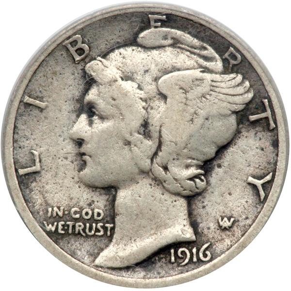 1916-D Mercury Dime. PCGS graded VF-30. Light even wear and lightly toned. Popular Key Date of which only 264,000 were made; most reached circulation. The typical grade seen is worn AG-3 or, if one is lucky, "some rims" Good-4. Watch the Mercury dime collectors hover around this attractive Lot like bees circling a hive! (PCGS # 4906) .