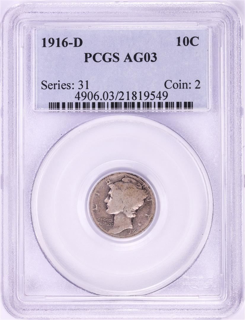 One 1916-D Mercury Dime Coin PCGS AG03. PCGS Graded.