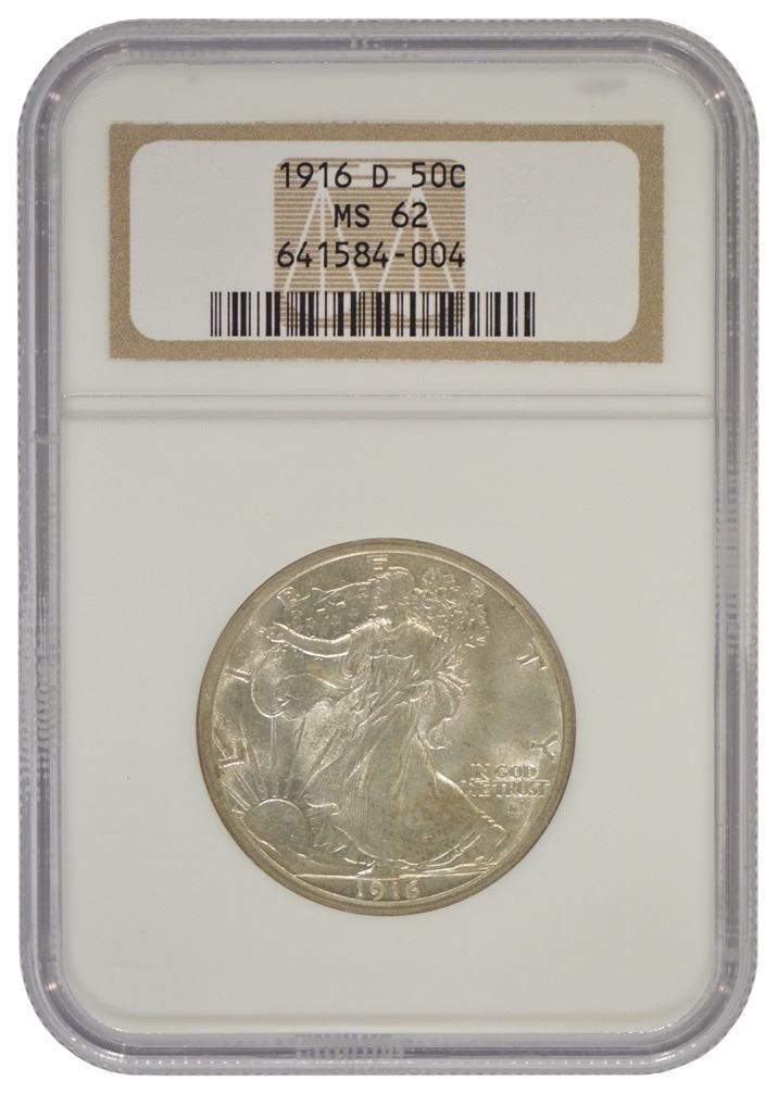 One 1916-D Walking Liberty Half Dollar Coin NGC MS62.