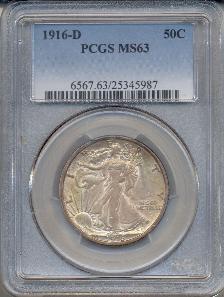 One 1916-D Walking Liberty Half Dollar Coin PCGS MS63.