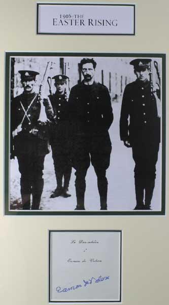 Signature on a with compliments slip. Attractively framed with modern copy photograph of Eamon De Valera as a prisoner after the 1916 Rebellion
