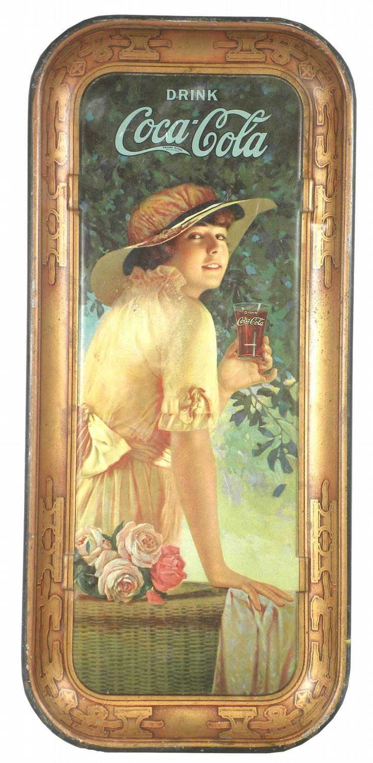 1916 "Elaine" Coca Cola Tin Serving Tray. Some glass bottom ring stains otherwise good condition. 8 5/8 X 19 inches.
