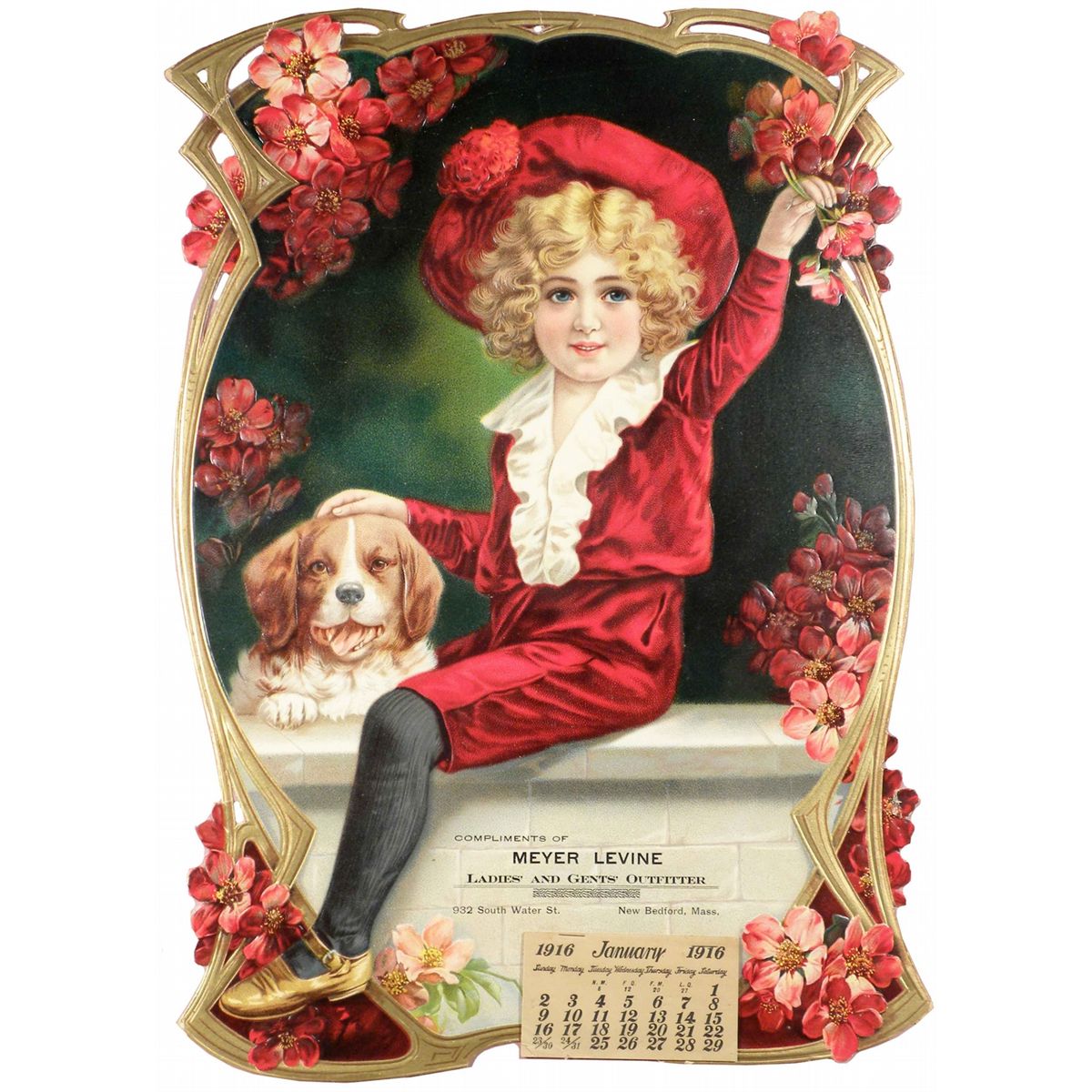 1916 Embossed Die Cut Calendar. Compliments of Meyer Levine. Ladies' and Gents' Outfitter, New Bedford, Mass. Full pad, framed in period gesso frame. Near mint condition. 14 X 20 inches.
