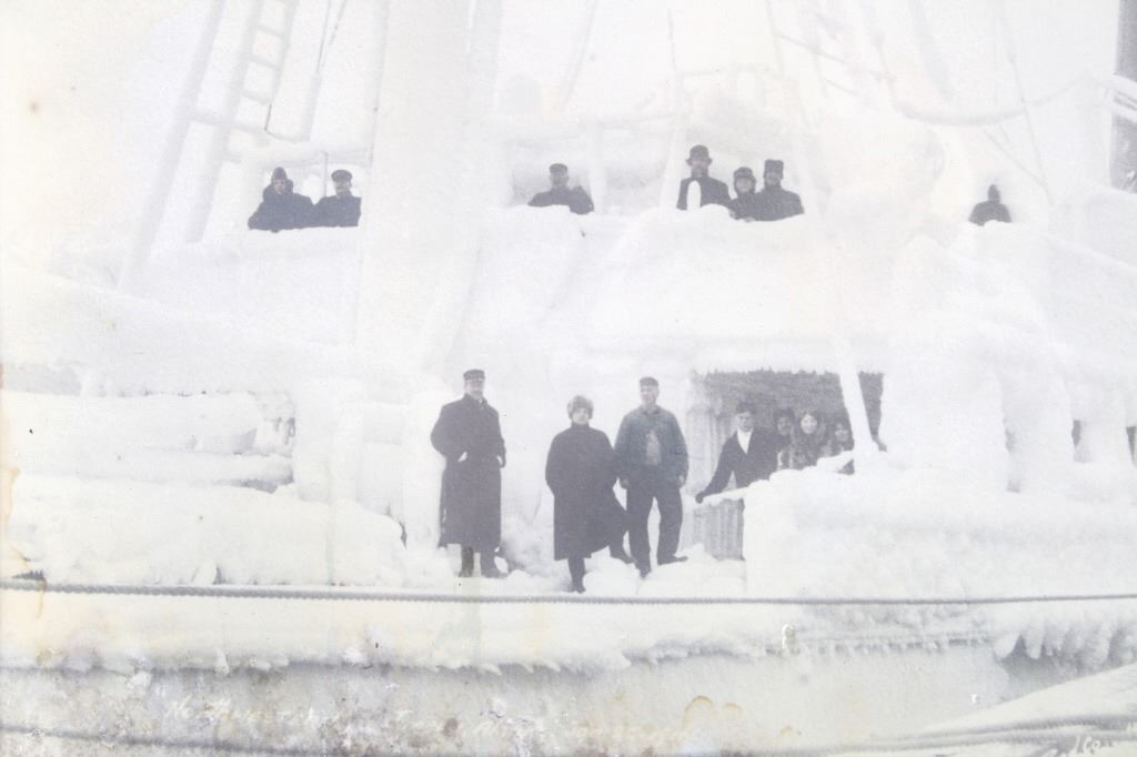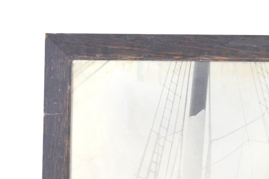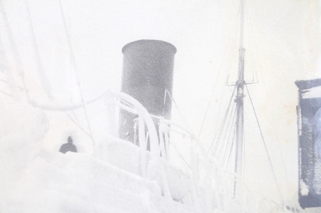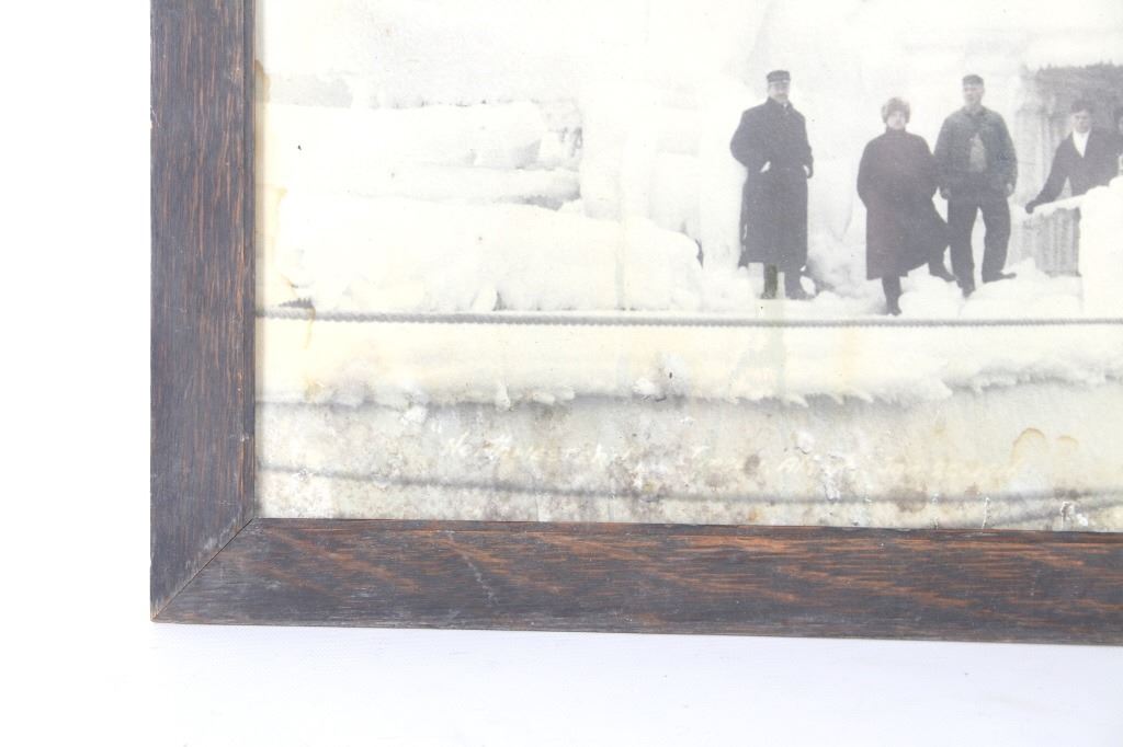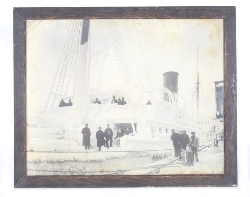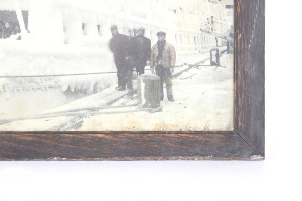 Featured in this lot is this photograph taken by John E. Thwaites on the Alaskan Coast on January 22nd, 1916. John Edward Thwaites was employed in Alaska by the federal government as a clerk for the Railway Mail Service during the early part of the 20th century. From 1905 to 1912 he settled into life onboard the wood hulled mailboat S.S. DORA owned by the Northwestern Steamship Company and traveled the route from Valdez to Unalaska delivering mail to the coastal communities. He was also an amateur photographer, who by using a Kodak camera, documented his experiences in Southeastern Alaska. Although not trained as a professional photographer, he quickly took advantage of the burgeoning postcard market selling thousands of photographic postcards depicting Alaska scenes. The photo depicts crew members standing on their boat, the U.S. Northwestern Steamer, after they have endured a snow storm. The boat is coated in large free form ice from the ropes, the metal bars, and halfway up the masts. The description on the bottom of the photo reads, "Northwestern Steamer, Alaska, Jan. 22nd, 1916". The photo is behind glass and set in a wooden frame. The photo is in good condition for its age but does have slight browning towards the edges. The frame is in good condition with slight wear from its use and age. The piece measures 17 1/4" L x 21 1/2" W.