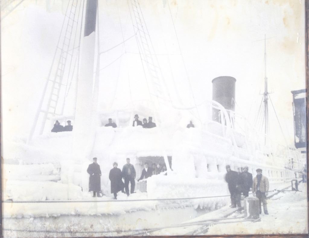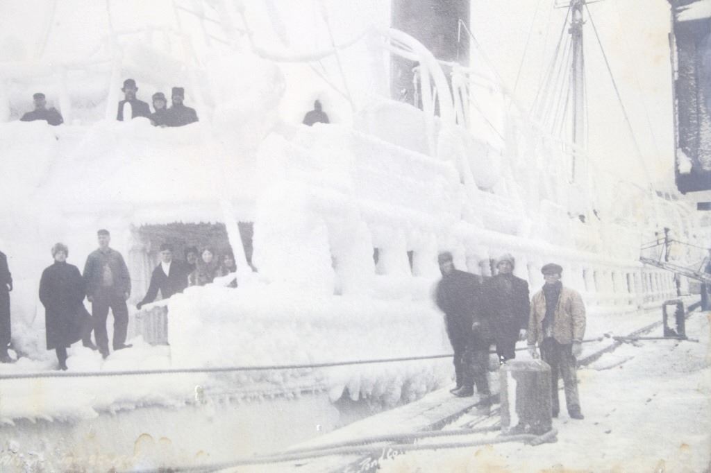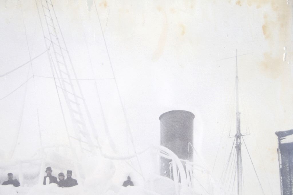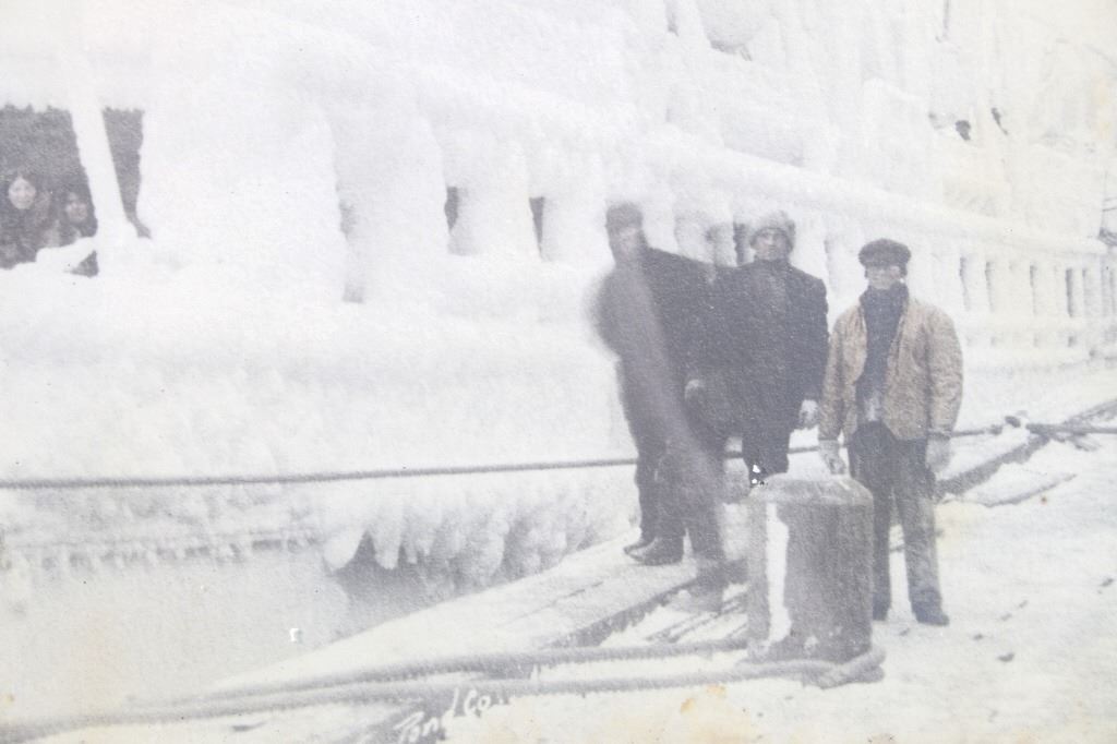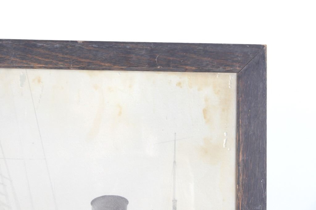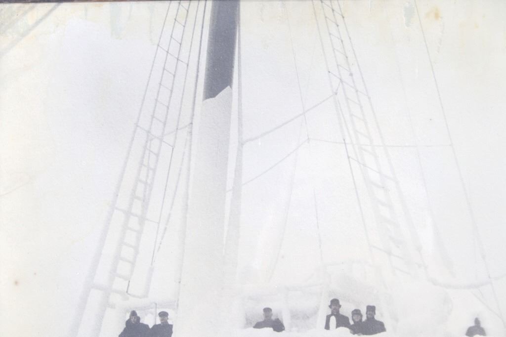 Featured in this lot is this photograph taken by John E. Thwaites on the Alaskan Coast on January 22nd, 1916. John Edward Thwaites was employed in Alaska by the federal government as a clerk for the Railway Mail Service during the early part of the 20th century. From 1905 to 1912 he settled into life onboard the wood hulled mailboat S.S. DORA owned by the Northwestern Steamship Company and traveled the route from Valdez to Unalaska delivering mail to the coastal communities. He was also an amateur photographer, who by using a Kodak camera, documented his experiences in Southeastern Alaska. Although not trained as a professional photographer, he quickly took advantage of the burgeoning postcard market selling thousands of photographic postcards depicting Alaska scenes. The photo depicts crew members standing on their boat, the U.S. Northwestern Steamer, after they have endured a snow storm. The boat is coated in large free form ice from the ropes, the metal bars, and halfway up the masts. The description on the bottom of the photo reads, "Northwestern Steamer, Alaska, Jan. 22nd, 1916". The photo is behind glass and set in a wooden frame. The photo is in good condition for its age but does have slight browning towards the edges. The frame is in good condition with slight wear from its use and age. The piece measures 17 1/4" L x 21 1/2" W.