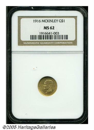 <B>1916<G$1> McKinley MS62 NGC.</B></I> Peach-gold surfaces display slightly deeper gold and light green dapples over each side. The design features are well impressed, and light handling marks are observed on the obverse.