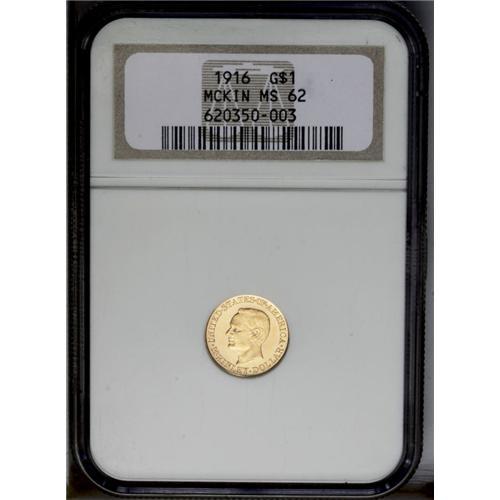 <B>1916<G$1> McKinley MS62 NGC.</B></I> Prooflike reflectivity dominates both sides, and the citrine fields contrast somewhat with the softly struck head of McKinley. Light abrasions define the grade.<BR><I>From The Carolina Gold Collection, Part Four.</B></I>
