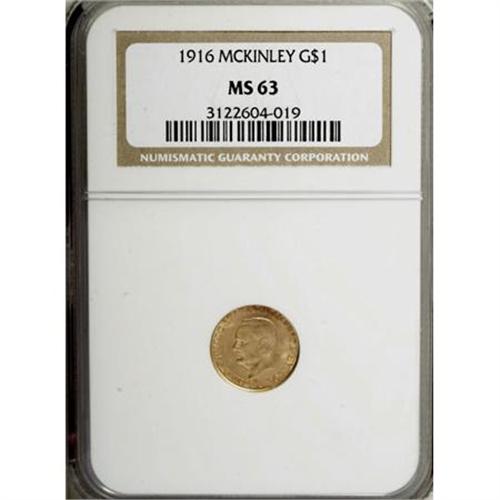 <B>1916 G$1 McKinley MS63 NGC.</B></I> NGC Census: (325/1483). PCGS Population (728/2745). Mintage: 9,977. Numismedia Wsl. Price for NGC/PCGS coin in MS63: $700. (#7454)<BR><BR><b>Shipping:</b> Coins & Currency (<a target="_blank" href="http://www.heritageauctions.com/common/shipping.php">view shipping information</a>)