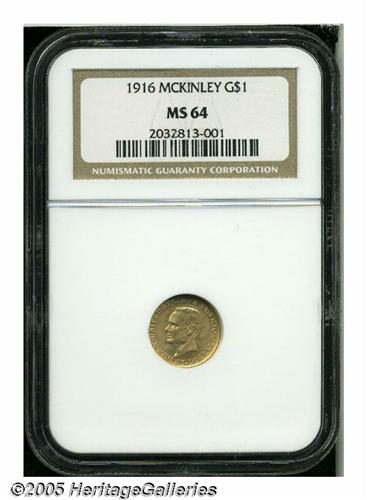 <B>1916<G$1> McKinley MS64 NGC.</B></I> Lustrous surfaces display apricot-gold patina with light green undertones. The design elements for the most part indicate a decent strike. A few miniscule ticks are noted on McKinley's cheek, with a more noticeable contact mark on the jaw bone.