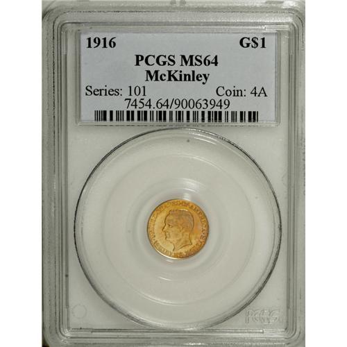 <B>1916 G$1 McKinley MS64 PCGS.</B></I> This strongly lustrous near-Gem has above-average definition, most notable at the hair and the memorial. The obverse and the flashy reverse are predominantly orange-gold, though the left and right periphery have paler straw-gold color.<BR><BR><b>Shipping:</b> Coins & Currency (<a target="_blank" href="http://www.heritageauctions.com/common/shipping.php">view shipping information</a>)