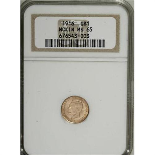 <B>1916 G$1 McKinley MS65 NGC.</B></I> Vibrant yellow-gold luster exudes from the well preserved surfaces of this lovely Gem. A well executed strike emboldens the design elements.<BR><I>From The Southwest Collection.</B></I><BR><BR><b>Shipping:</b> Coins & Currency (<a target="_blank" href="http://www.heritageauctions.com/common/shipping.php">view shipping information</a>)