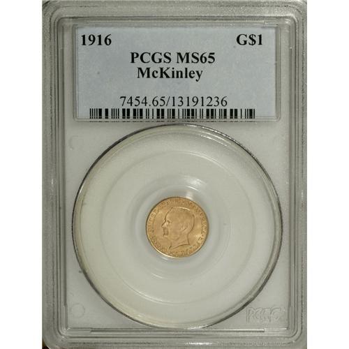 <B>1916 G$1 McKinley MS65 PCGS.</B></I> A delightful wheat-colored Gem representative of this McKinley Birthplace Memorial piece, from the second of three issues to depict the "gold bug" president. Well-defined with hardly any flaws visible to the unaided eye.<BR><BR><b>Shipping:</b> Coins & Currency (<a target="_blank" href="http://www.heritageauctions.com/common/shipping.php">view shipping information</a>)