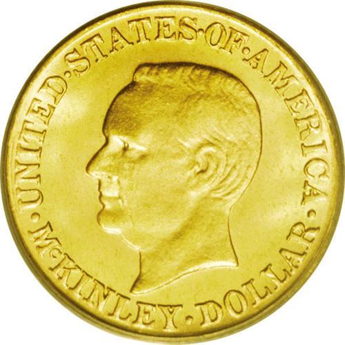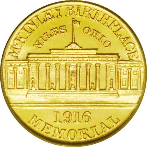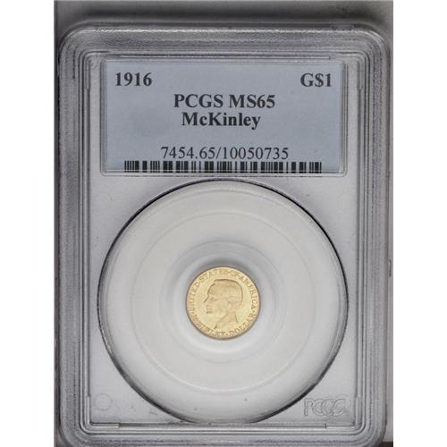 <B>1916<G$1> McKinley MS65 PCGS.</B></I> A shimmering example with a hint of green-gold color. Exceptionally clean surfaces with superior luster that swirls around the coin as it is tilted beneath a light. A most attractive Gem gold commemorative.