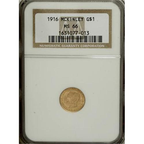 <B>1916 G$1 McKinley MS66 NGC.</B></I> This is an impressive Premium Gem with glowing luster and honey-gold toning imbued with lime accents. Many examples of this issue have less luster than this piece, and most show at least of couple of trivial tick marks on the devices. This piece is more carefully preserved than most, and the surfaces are essentially blemish-free. <BR><BR><b>Shipping:</b> Coins & Currency (<a target="_blank" href="http://www.heritageauctions.com/common/shipping.php">view shipping information</a>)