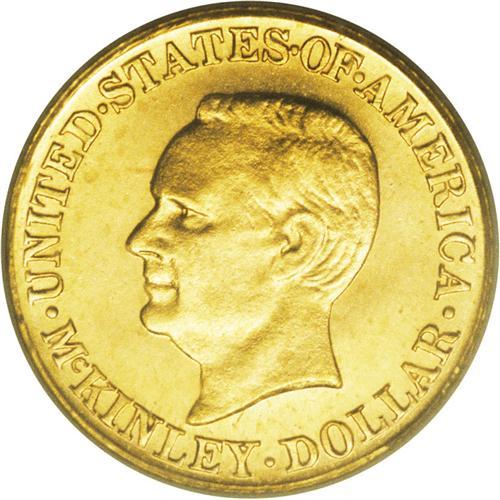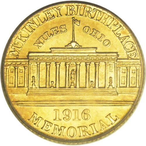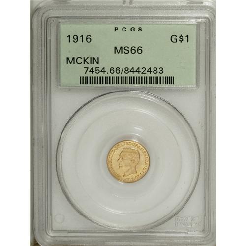 <B>1916 G$1 McKinley MS66 PCGS.</B></I> Like Abraham Lincoln and John F. Kennedy, William McKinley has been depicted on a United States coin (the other assassinated president, James Garfield, had only a couple of paper money appearances.) Though McKinley's portrait graces three separate issues, fewer than 40,000 pieces bearing his likeness, all gold dollar commemoratives, were issued overall.<BR> This honey-gold example, one of fewer than 10,000 believed to have escaped melting, is from the second issue, the 1916 McKinley Birthplace Memorial gold dollar. It is solidly struck with a hint of reflectivity in the fields and has hardly any mentionable marks.<BR><BR><b>Shipping:</b> Coin/Currency (<a target="_blank" href="http://www.heritageauctions.com/common/shipping.php">view shipping information</a>)