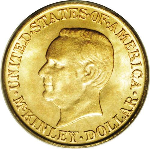 <B>1916<G$1> McKinley MS66 PCGS.</B></I> This pristine example is remarkably free of abrasions on either side, with pleasing greenish-copper and yellow-gold hues and a couple of straight, darker toning lines noted on the obverse behind President McKinley's head. The reverse die, unusually for a gold commemorative, is somewhat rotated with respect to the obverse.