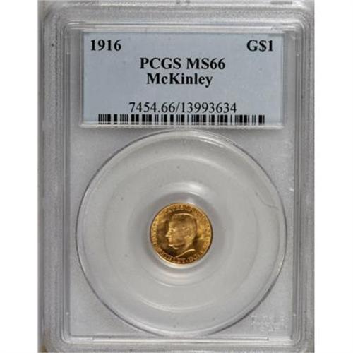 <B>1916 G$1 McKinley MS66 PCGS.</B></I> The McKinley gold dollars of 1916 and 1917 were the final bow for that denomination in the United States, coming over a quarter-century after the legislation that removed authorization for the Mint to strike such pieces for circulation. This 1916 piece offers excellent surface quality and uncommonly strong luster. The well-defined devices emerge from straw-gold surfaces that possess canary accents.<BR><BR><b>Shipping:</b> Coins & Currency (<a target="_blank" href="http://www.heritageauctions.com/common/shipping.php">view shipping information</a>)