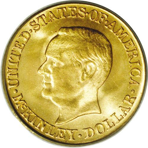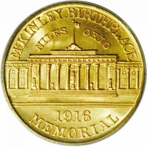 <B>1916<G$1> McKinley MS67 PCGS.</B></I> Ex: Swiss America/Dr. Merritt. An Act of Congress on February 23, 1916 authorized the construction of the McKinley Birthplace Memorial. To help defray costs, it was authorized that not over 100,000 gold dollars of commemorative designs be struck at the Philadelphia Mint only, and afterward, the dies were to be destroyed. Charles Barber designed the obverse, George T. Morgan designed the reverse.<BR> The Philadelphia Mint struck 20,026 gold dollars during August and October, 1916. These were placed on the market for $3 apiece, with the sellers either unaware or choosing to forget that the 1903 and 1904-5 gold dollars were impossible to sell in any quantity at that figure. Only approximately 15,000 were sold.<BR> By 1917, the committee in charge realized the futility in this pricing structure and dumped a total of 10,000 coins at a lower figure to B. Max Mehl in Ft. Worth Texas who offered them to collectors at $2.50 each. It is uncertain whether Mehl's consignment consisted of only 1917s or a mixture of the two dates. In either event, the Association returned 10,023 pieces of the 1916 issue to the Mint for melting.<BR> The highly lustrous reddish peach-gold and mint-green surfaces are amazingly smooth and essentially pristine. The striking details on each side of the coin are noticeably sharper than usual for this issue.