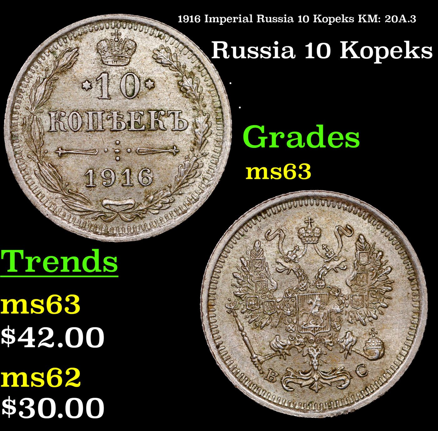 1916 Imperial Russia 10 Kopeks KM: 20A.3 Grades Select Unc.