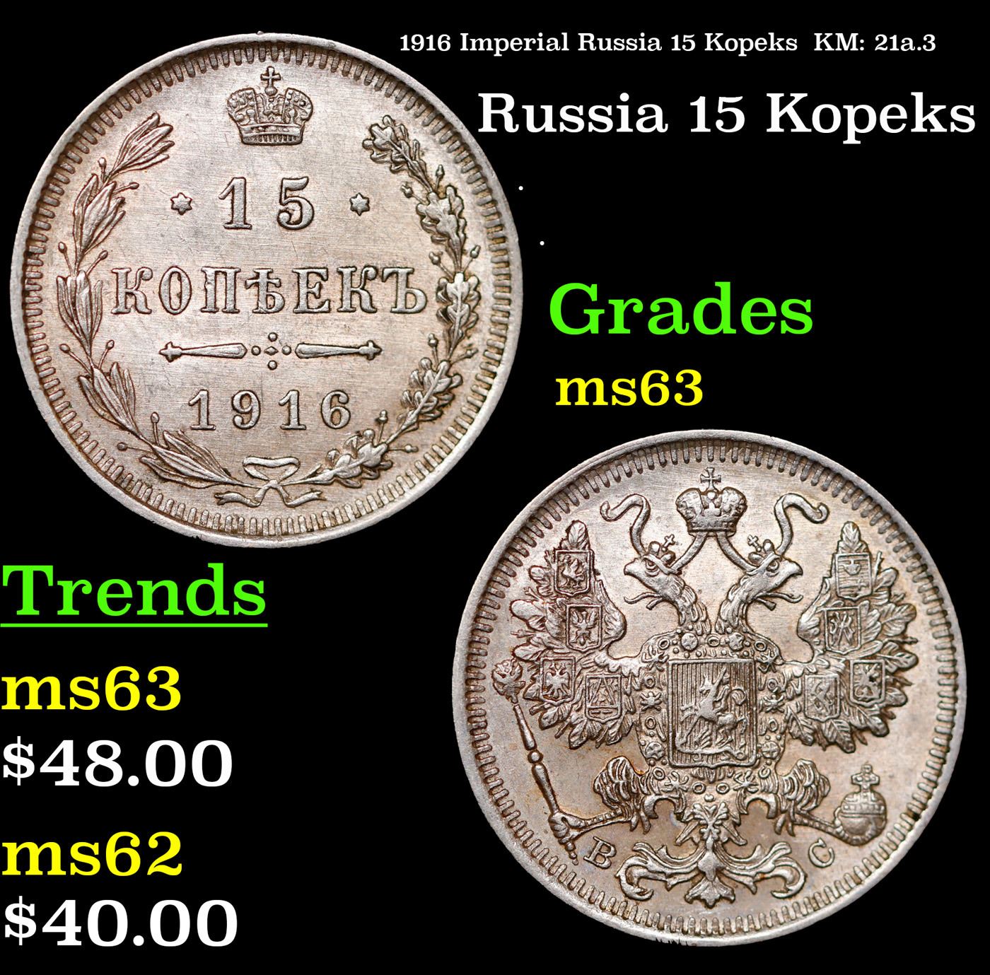 1916 Imperial Russia 15 Kopeks KM: 21a.3 Grades Select Unc.