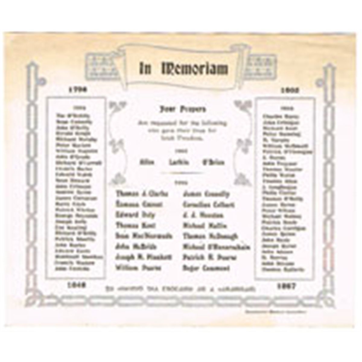 A single page appeal for subscriptions issued by the committee to raise funds for the dependants of imprisoned or dead volunteers. Printed by Corcoran, Cork. Also with In Memoriam single page asking for prayers for those who "gave their lives for Irish Freedom", decorated with the names of those killed or executed during the 1916 Rebellion. Produced by the Manchester Martyrs Committee. (2 items)