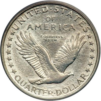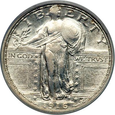 1916 Liberty Standing Quarter Dollar. PCGS graded AU-53. Popular key date. A nice untoned example. The standing Liberty quarter was introduced in 1916 to replace the Barber design of 1892-1916, and was "intended to typify in a measure the awakening interest of the country to its own protection," Mint Director von Engelken said at the time the coins first appeared early in 1917. "In the new design Liberty is shown a full-length figure, front view, with head turned toward the left, stepping forward to the gateway of the country .The left arm of the figure of Liberty is upraised, bearing the shield in the attitude of protection, from which the covering is being drawn. The right hand bears the olive branch of peace.