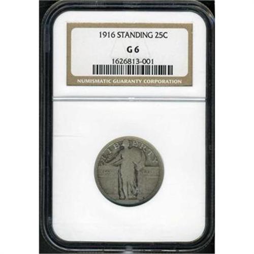 <b>1916 Liberty Standing Quarter Dollar. NGC graded G6.</b> Clear, if somewhat weak date; smooth surfaces, natural patina, and that greatest of all diagnostics that separate the "name" coins from the common herd, low mintage. For there were only 52,000 of these made, and most found their way into circulation. The key date in the series (unlike the other first year issues, 1916 Mercury dime and 1916 walking Liberty half which were hoarded in greater numbers) <b>(PCGS # 5704)</b>