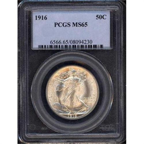 <b>1916 Liberty Walking Half Dollar. PCGS graded MS65.</b> A satiny gem with bursts of vibrant white luster on both sides. Nearly fully struck, with just a hint of weakness at the centers, but far sharper than average (the D and S mints this year tend to be even weaker than the fresh and velvety P-mint date) <b>(PCGS # 6566)</b>