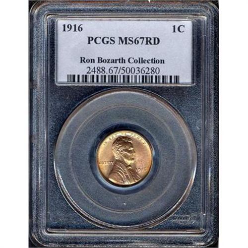 <b>1916 Lincoln Cent. PCGS graded MS67 R Ex Ron Bozarth Collection.</b> The brilliant copper surfaces are smooth from rim to rim with no carbon to report. This date is famous for its rich velvety smooth finish, and the Ron Bozarth Collection specimen offered here has just such a finish. Sharply struck, too, and fully, gloriously lustrous, both sides possess eye appeal to spare. Struck with methodical precision throughout <b>(PCGS # 2488)</b>