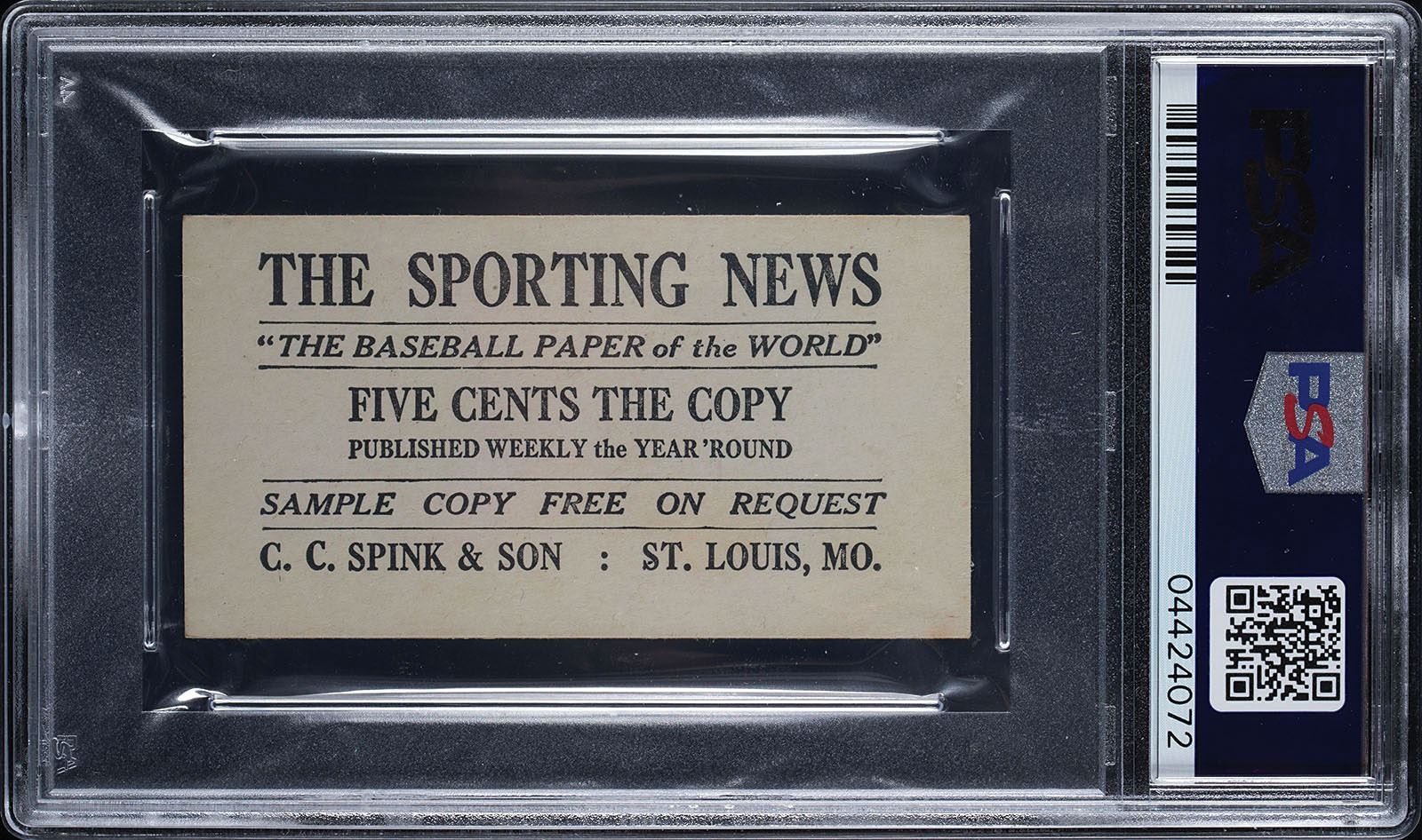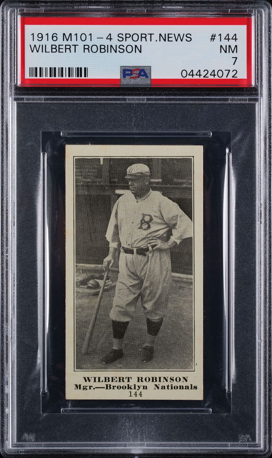 Graded by PSA NM 7. Appearing to be a NM-MT card, closer scrutiny reveals a light touch on the upper left corner. Card contains a superb image with bold reverse print.