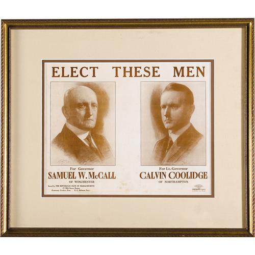 <B>1916 McCall & Coolidge Massachusetts Governor Campaign Poster.</B></I> 12.5" x 10", framed and matted under glass to an overall size of 19.25" x 16.75", issued by the Republican Club of Massachusetts, Boston, 1916. Features portraits of Samuel W. McCall and Calvin Coolidge with the title "Elect These Men". The men were successful in their bid for Governor and Lt. Governor and Coolidge succeeded McCall as Governor in 1919. This was yet another step in Coolidge's ultimate political climb to President. This is a beautiful piece virtually free from defects and attractively presented in a modern gilt wood frame. Campaign items from Coolidge's campaign for Lt. Governor are rarely encountered, and this poster is far more significant than the varieties of coat-tail posters one encounters from 1920 and 1924. We do not recall ever seeing this variety before.<BR><BR><b>Shipping:</b> Framed (<a target="_blank" href="http://www.heritageauctions.com/common/shipping.php">view shipping information</a>)