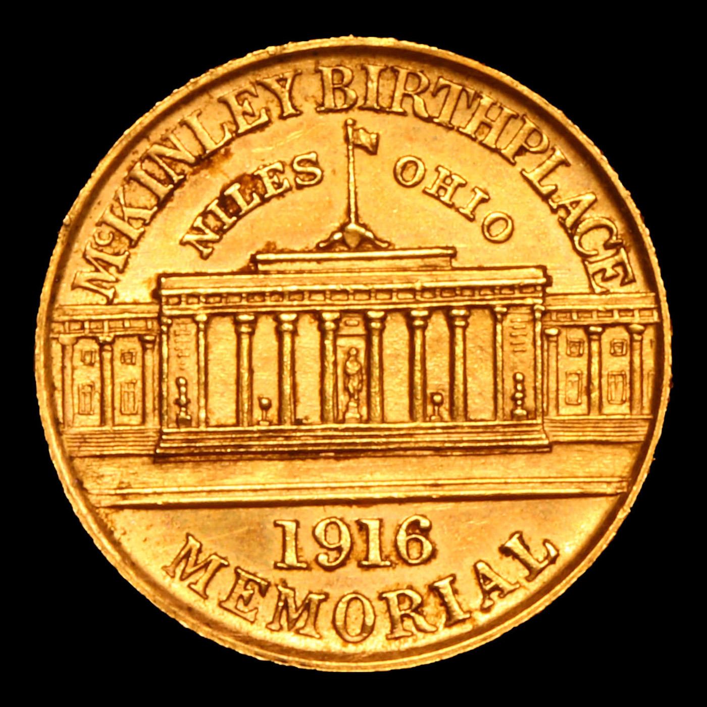 1916 McKinley Gold Commem Dollar 1 Grades Select Unc. Issued in 1916 on the 75th Anniversary of McKinley's Birth, but Due to His Untimely Demise by an Assassin, this Commemorative was Issued to Help Create a Memorial in his Hometown. When Examining a McKinley Commem, Points to Examine for the First Signs of Wear include McKinley’s Temple and the Hair Above His Ear; on the Reverse, Check the Pillar Above the Second Numeral 1 and the Base of the Flagpole.