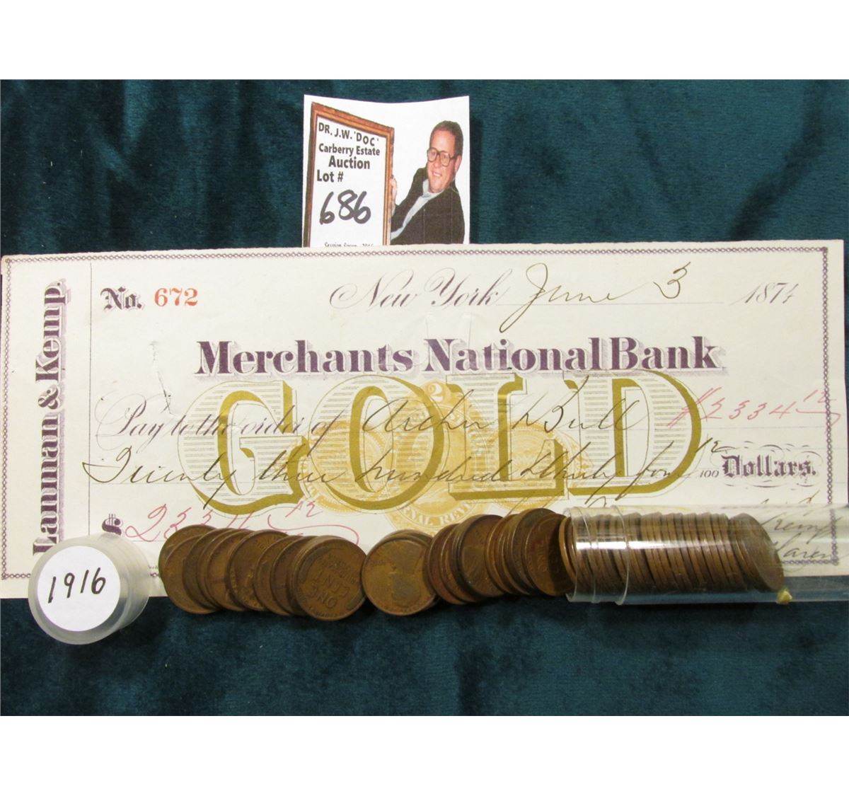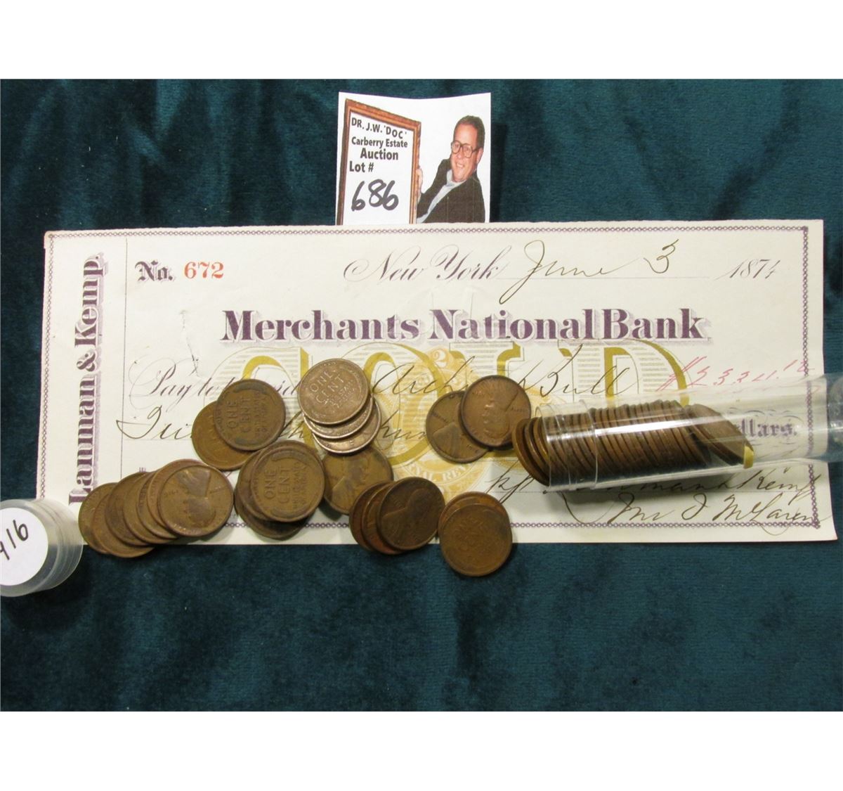 1916 P Roll of U.S. Wheat Cents in circulated condition in a plastic tube, approx. 50 pcs.; & 1874 Check drawn on Merchants National Bank in New York, "GOLD' center with Internal revenue Prestamp.