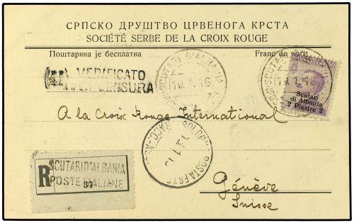 1916 Registered post card from the President of the Society of the Serbian Red Cross bearing 2 piastre on 50 cents violet (Yvert 95) tied by SCUTARI D´ALBANIA POSTE ITALIANE double ring with registered label and CENSURA hand-stamp routed via Milano to the International Red Cross in Geneva. Very fine and rare franking.