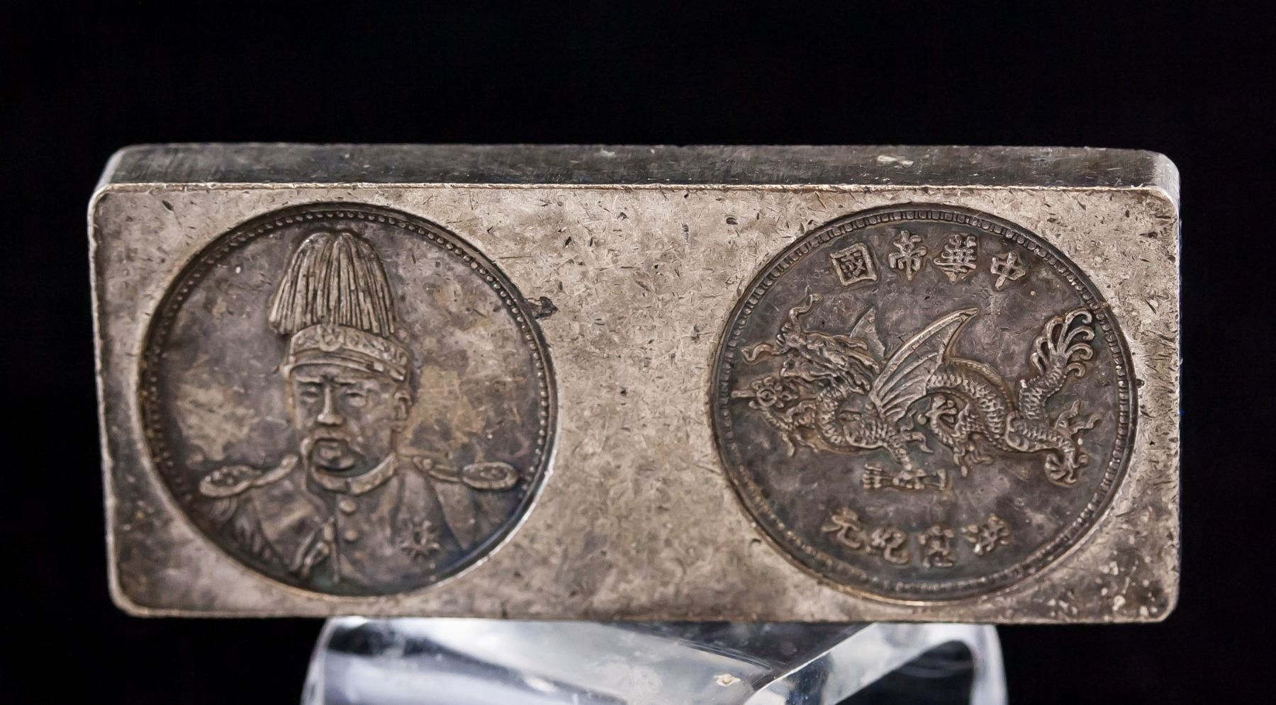1916 Republic China coin stamp sample. Obverse stamped 1916 Yuan Shikai dragon coin. Reverse lettering KM 1458, Cheng Se 9800, Zhong Liang 2000 Shi Liang. 52 x 22 mm, 58.09 grams