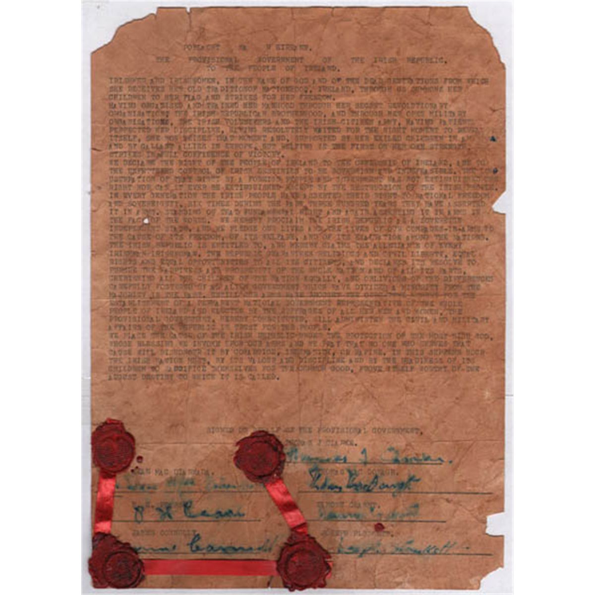 Three facsimile copies of important documents relating to the 1916 rebellion. The proclamation of the Irish Republic, Pearse's surrender note and the national anthem. Convincingly produced for a display or exhibition. Also with 1960s newspaper clippings relating to the War of Independence