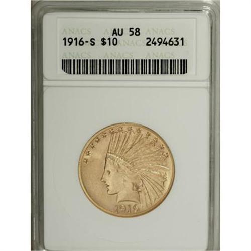 <B>1916-S $10 AU58 ANACS.</B></I> A highly lustrous near-Mint example of this popular San Francisco issue. The satiny, almost granular surfaces exhibit lovely yellow-gold color with subtle pink undertones on the reverse. Just a touch of wear appears above Liberty's eye.<BR><BR><B>Coin Engraver:</B> Augustus Saint-Gaudens<BR><BR><b>Shipping:</b> Coins & Currency (<a target="_blank" href="http://www.heritageauctions.com/common/shipping.php">view shipping information</a>)