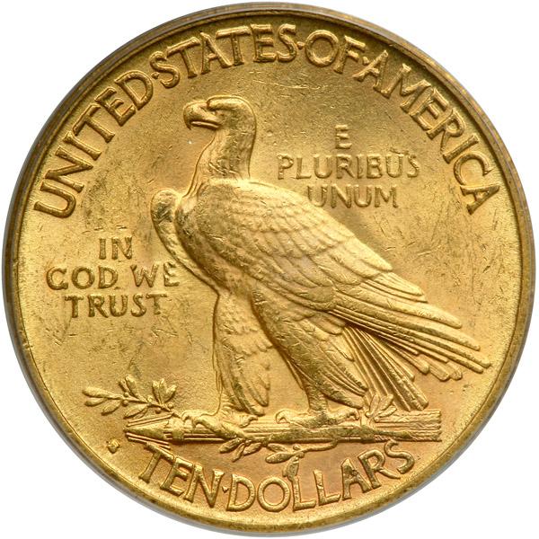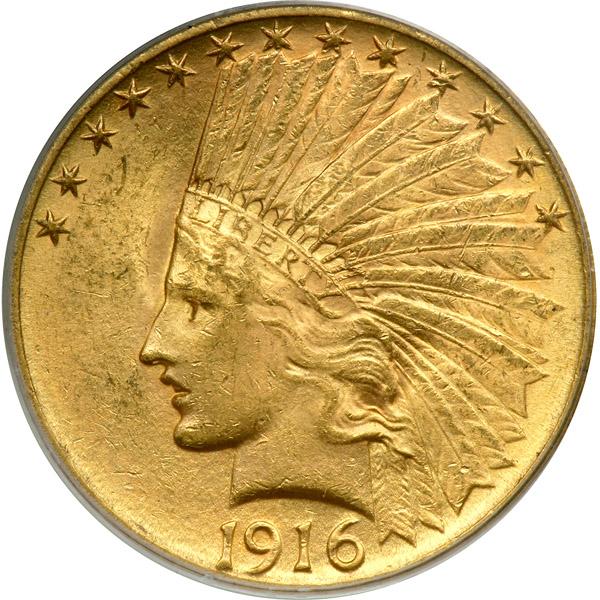 1916-S $10 Indian. PCGS graded MS-62. Well struck with nice original toning. A coin that should be graded MS-63 thus our Premium Quality designation. San Francisco was the only U.S. mint striking currency gold coinage in 1916 (as opposed to Commemorative gold). This branch issued half eagles, eagles, and double eagles. In 1917-1919, no gold coins came off the Mints' presses. Production resumed in 1920 (PCGS # 8880) .