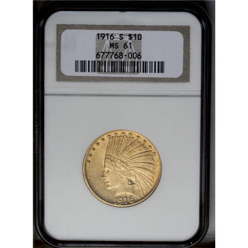 1916-S $10 MS61 NGC. A well struck wheat-gold example