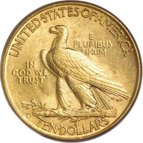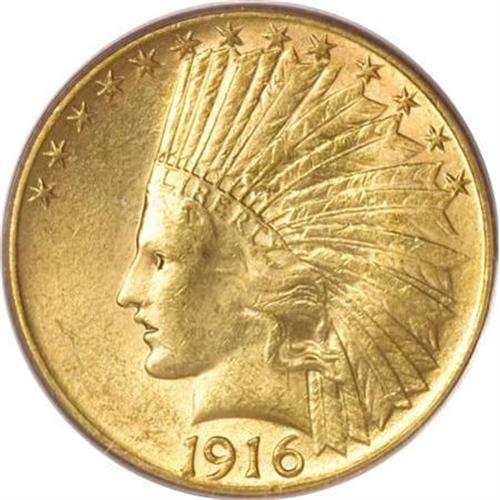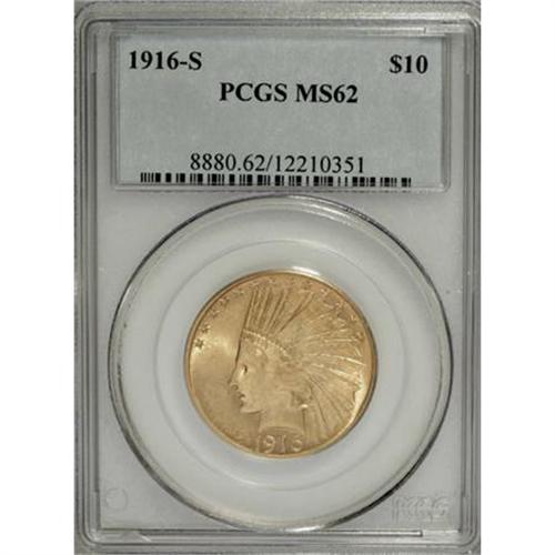 <B>1916-S $10 MS62 PCGS.</B></I> Although less rare than certain other Indian eagles at the MS62 grade level, finer examples are infrequently seen. The denomination was only coined in San Francisco during the year, and it was the last of its kind until 1920. A pleasing Mint State representative, this piece has lustrous light yellow surfaces with only minor imperfections. <BR><BR><B>Coin Engraver:</B> Augustus Saint-Gaudens<BR><BR><b>Shipping:</b> Coins & Currency (<a target="_blank" href="http://www.heritageauctions.com/common/shipping.php">view shipping information</a>)