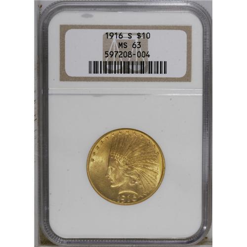 1916-S $10 MS63 NGC. An attractive orange-gold example