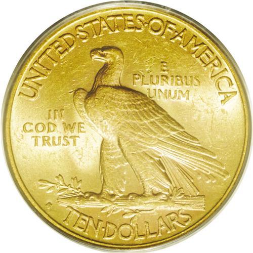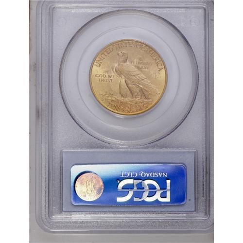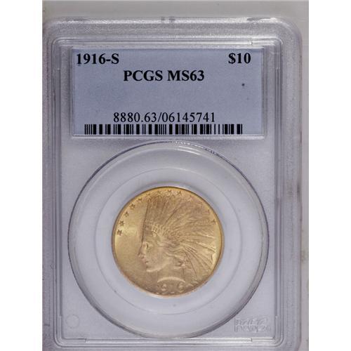 <B>1916-S<$10> MS63 PCGS.</B></I> For the 10-year period between 1916 and 1925, only the San Francisco Mint struck ten dollar pieces, and then only in 1916 and 1920. By that time, gold coins no longer circulated, and although they remained important to foreign trade, the double eagle was more convenient for that purpose. This satiny example lacks obtrusive marks, and displays attractive blended peach and yellow-green toning.