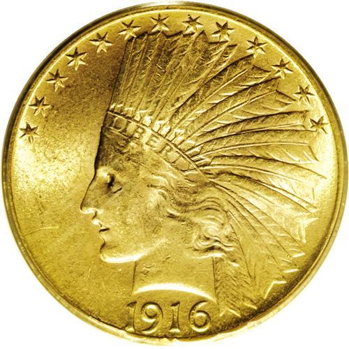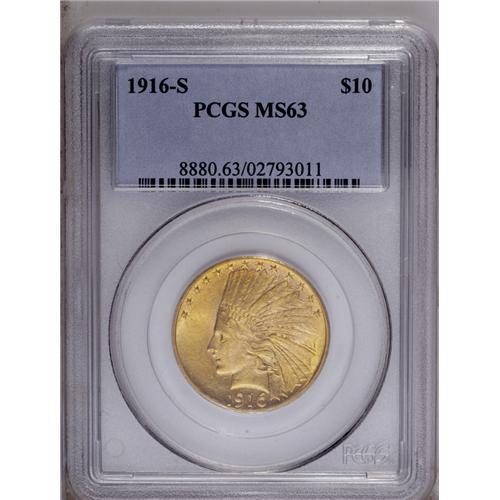 <B>1916-S $10 MS63 PCGS.</B></I> This is a splendid example with reddish-orange toning over frosty, yellow-gold luster. The surfaces have a pebbled "orange peel" appearance, typical of so many gold and silver coins of this and the adjacent years. Population: 58 in 63, 44 finer (12/05).