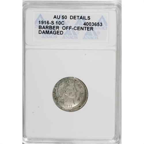 <B>1916-S 10C Barber Dime--Damaged, Off Center--ANACS. AU50 Details. </B></I><BR><BR><B>Coin Engraver:</B> Charles E. Barber<BR><BR><b>Shipping:</b> Coins & Currency (<a target="_blank" href="http://www.heritageauctions.com/common/shipping.php">view shipping information</a>)