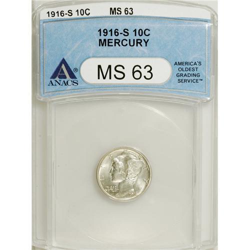 <B>1916-S 10C MS63 ANACS.</B></I> NGC Census: (59/260). PCGS Population (101/335). Mintage: 10,450,000. Numismedia Wsl. Price for NGC/PCGS coin in MS63: $53. (#4908)<BR><BR><b>Shipping:</b> Coins & Currency (<a target="_blank" href="http://www.heritageauctions.com/common/shipping.php">view shipping information</a>)