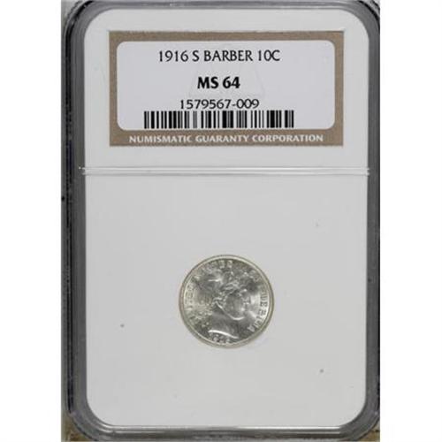 <B>1916-S 10C MS64 NGC.</B></I> NGC Census: (59/36). PCGS Population (71/56). Mintage: 5,820,000. Numismedia Wsl. Price for NGC/PCGS coin in MS64: $290. (#4871)<BR><BR><B>Coin Engraver:</B> Charles E. Barber<BR><BR><b>Shipping:</b> Coins & Currency (<a target="_blank" href="http://www.heritageauctions.com/common/shipping.php">view shipping information</a>)