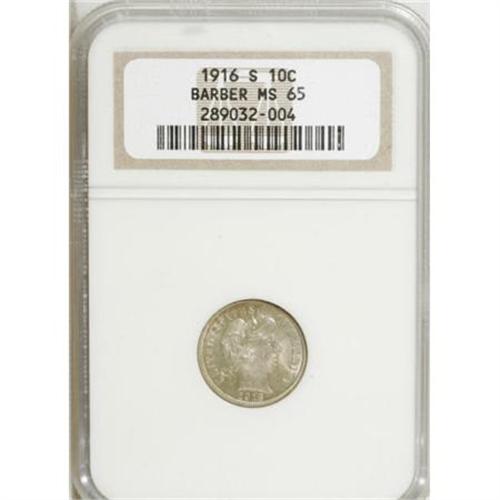 <B>1916-S 10C MS65 NGC.</B></I> Streaks of sky-blue, apple-green, and autumn-gold grace this meticulously struck and lustrous Gem. Minor contact near the nose is of little import. Census: 27 in 65, 9 finer (1/08).<BR><I>From The Southwest Collection.</B></I><BR><BR><B>Coin Engraver:</B> Charles E. Barber<BR><BR><b>Shipping:</b> Coins & Currency (<a target="_blank" href="http://www.heritageauctions.com/common/shipping.php">view shipping information</a>)