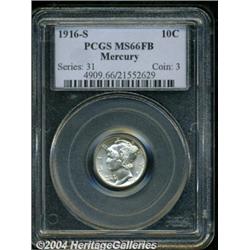 <B>1916-S<10C> MS66 Full Bands PCGS.</B></I> This issue is moderately scarce in Mint State condition. The present example is nearly untoned and brilliant, and above average in strike for the date, the only weakness being in some of the hair around Mercury's ear. A couple of light, hardly noticeable contacts do not detract from the overall eye appeal. Population: 40 in 66, 5 finer (3/04). <BR><BR><B>Important notice:</B> Heritage usually auctions material at the rate of 200-250 lots per hour. On some occasions eBay Live bid software or the Internet may not be able to keep up with the pace of the auction. We recommend placing a realistic absentee bid now as insurance to avoid disappointment. Occasionally the auctioneer may eliminate or reject an eBay Live bid, and the auctioneer may also reopen a lot after the close of the eBay live bidding (usually because we missed an audience bid), and may reject your bid even if it shows you as the winning bidder. By bidding via eBay Live, you agree that Heritage may award the lot to another bidder at its sole discretion under the circumstances described above or any other reasonable circumstances. Since eBay bids are not shown to us until we open the lot on the floor, we treat those bids just like floor bids. In most cases the floor responds before the eBay bid is presented to us, due to Internet lag time, so for consistency we have made it a policy that floor bids are always considered first over tie eBay live bids. Also please note that all Heritage lots purchased through eBay Live carry a 20% Buyer's Premium. Please make sure you read the Terms and Conditions before you bid.