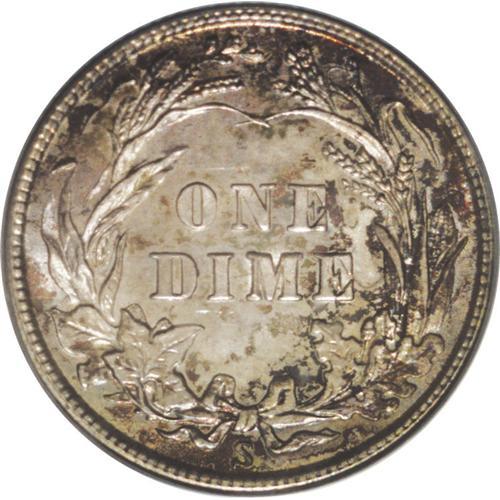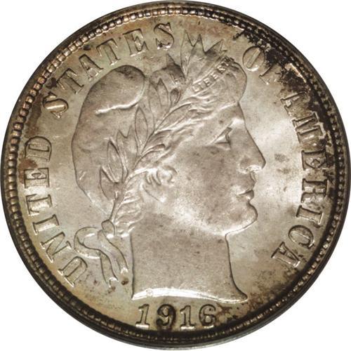 <B>1916-S<10C> MS66 PCGS.</B></I> This penetratingly struck Premium Gem features iridescent pink-red, powder-blue, apricot, lime, and russet shades. Contact is minimal, and the luster is dazzling. Although the Barber half and quarter were not struck at the branch mints in 1916, the San Francisco Mint managed to strike nearly 6 million Barber dimes that year, in addition to more than 10 million pieces of the new Winged Liberty type. Population: 14 in 66, 0 finer (6/06).<BR><I>From The Belle Glade Collection.</B></I>